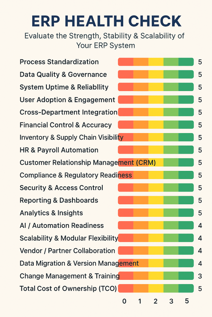 Comprehensive diagnostic model that evaluates every critical aspect of ERP maturity.Below is a professionally structured “ERP Health Check Scorecard — 20 Dimensions” document with: